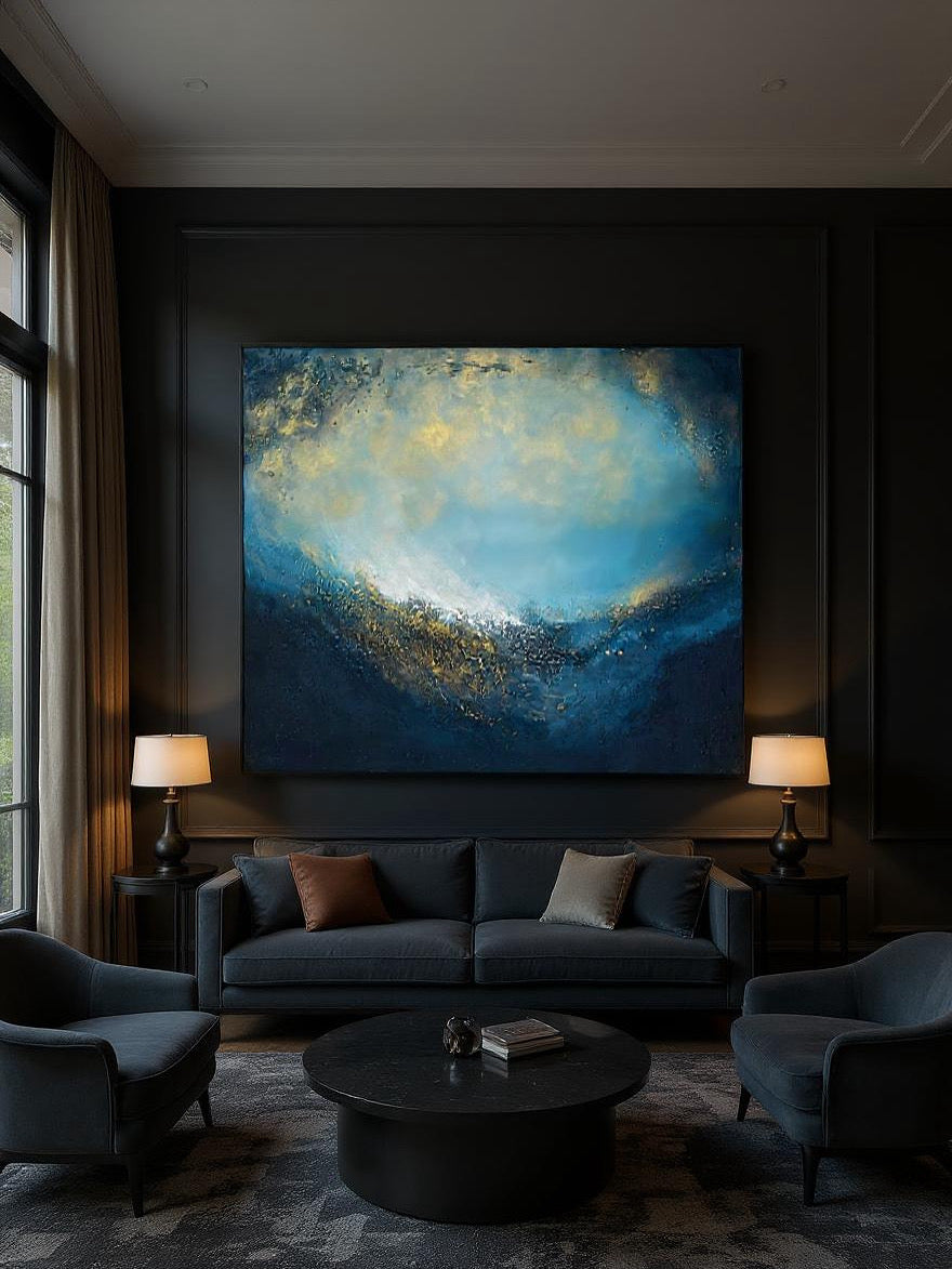 A moody, emotional piece painted in deep, immersive blue with textured surface.