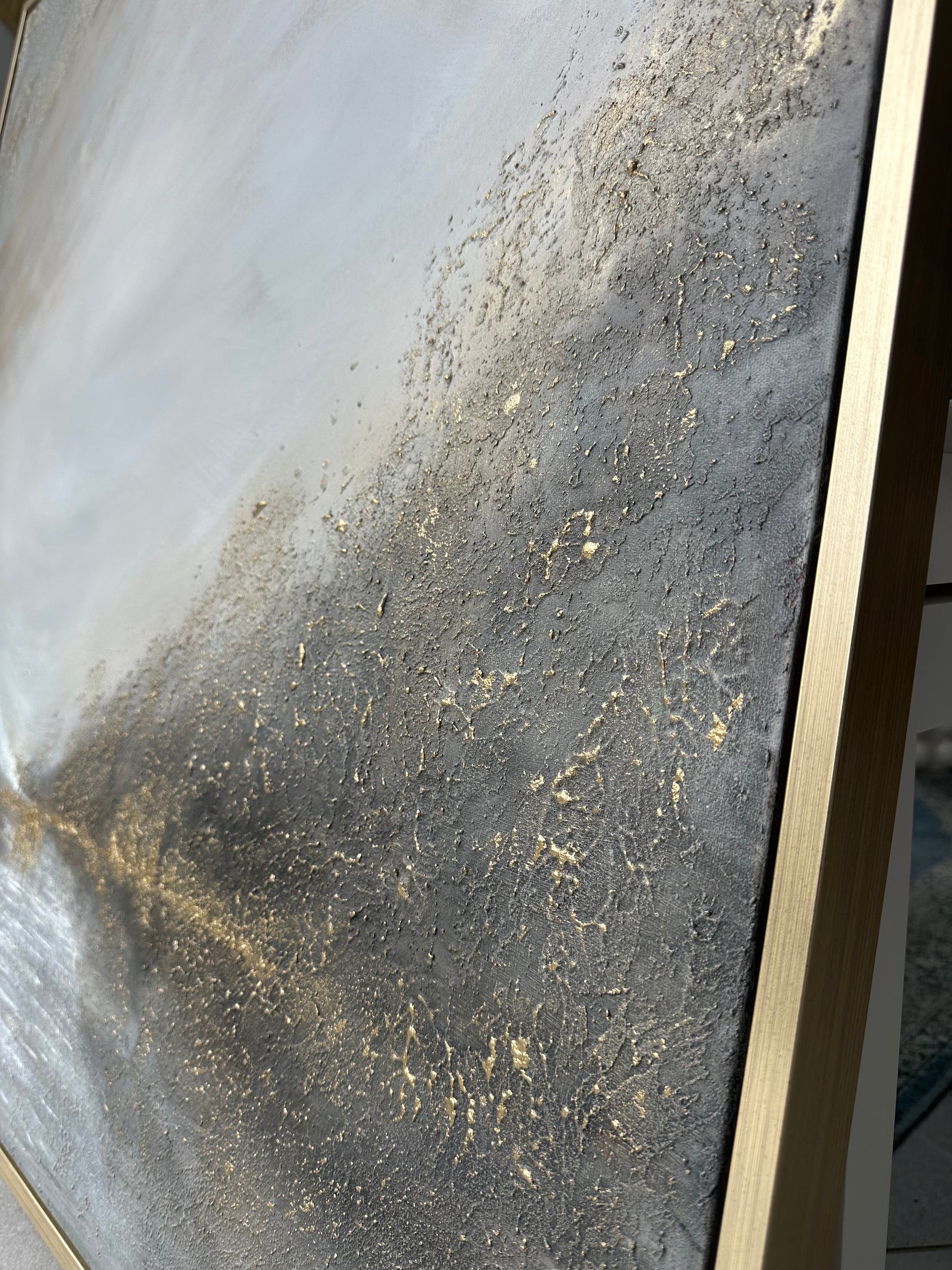 A heavily textured abstract landscape featuring rich deep browns and soft beige tones. Subtle, yet striking, touches of deep gold are incorporated, adding an elegant and gorgeous shimmer throughout the piece.